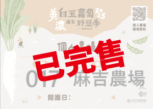- 二、白玉蘿蔔和毛豆是新鮮農產品,成長需要一定時間,不是現成的工廠製品,無法 隨意增加或減少。 請體諒個人農場農民們經營及耕作的辛苦,如果已與農民事先預訂好體驗時間及採收數量,一定要準時赴約,以免浪費農民心血以及新鮮農作物。